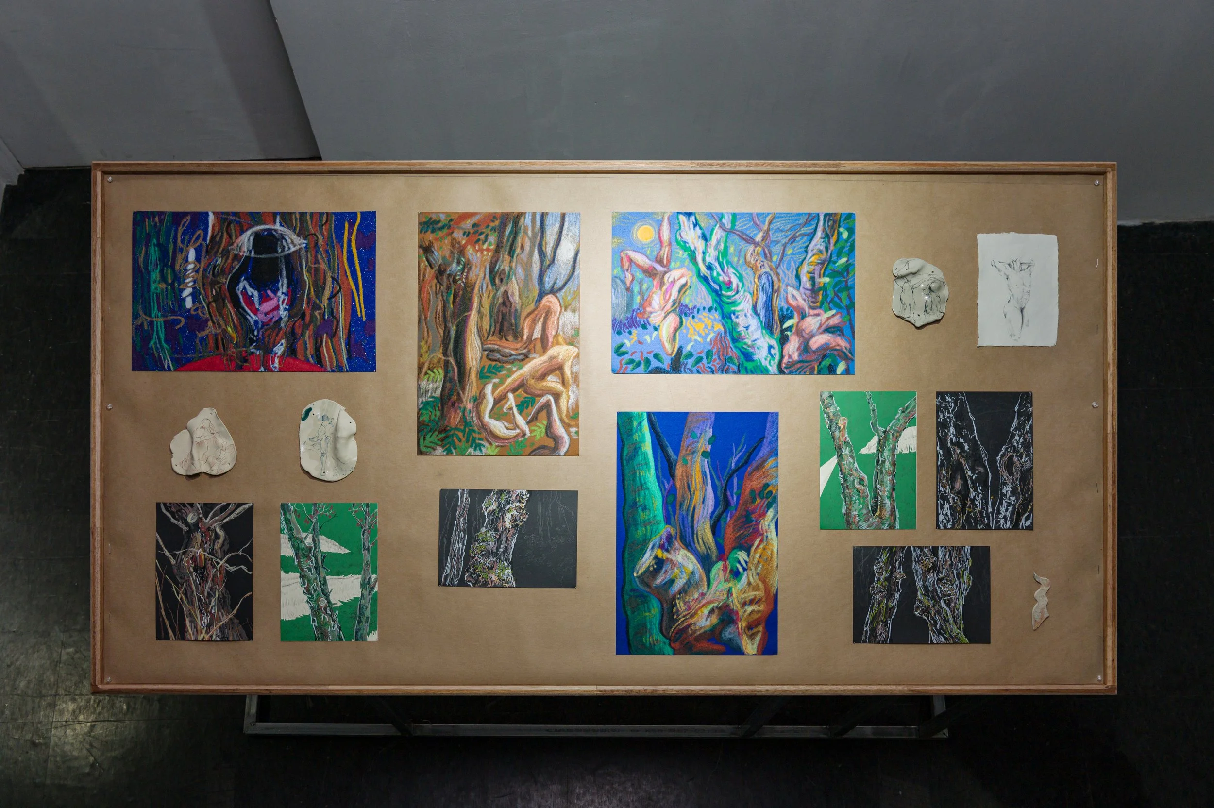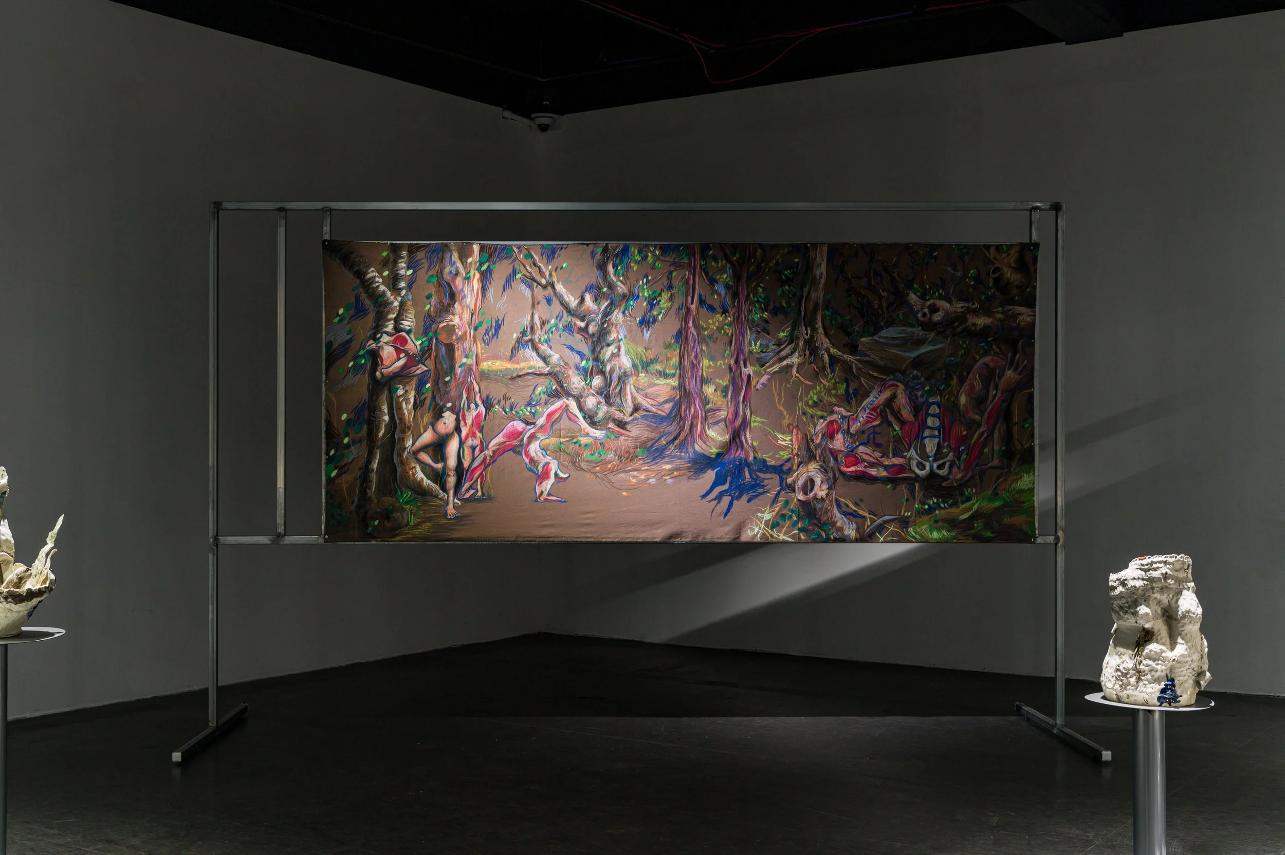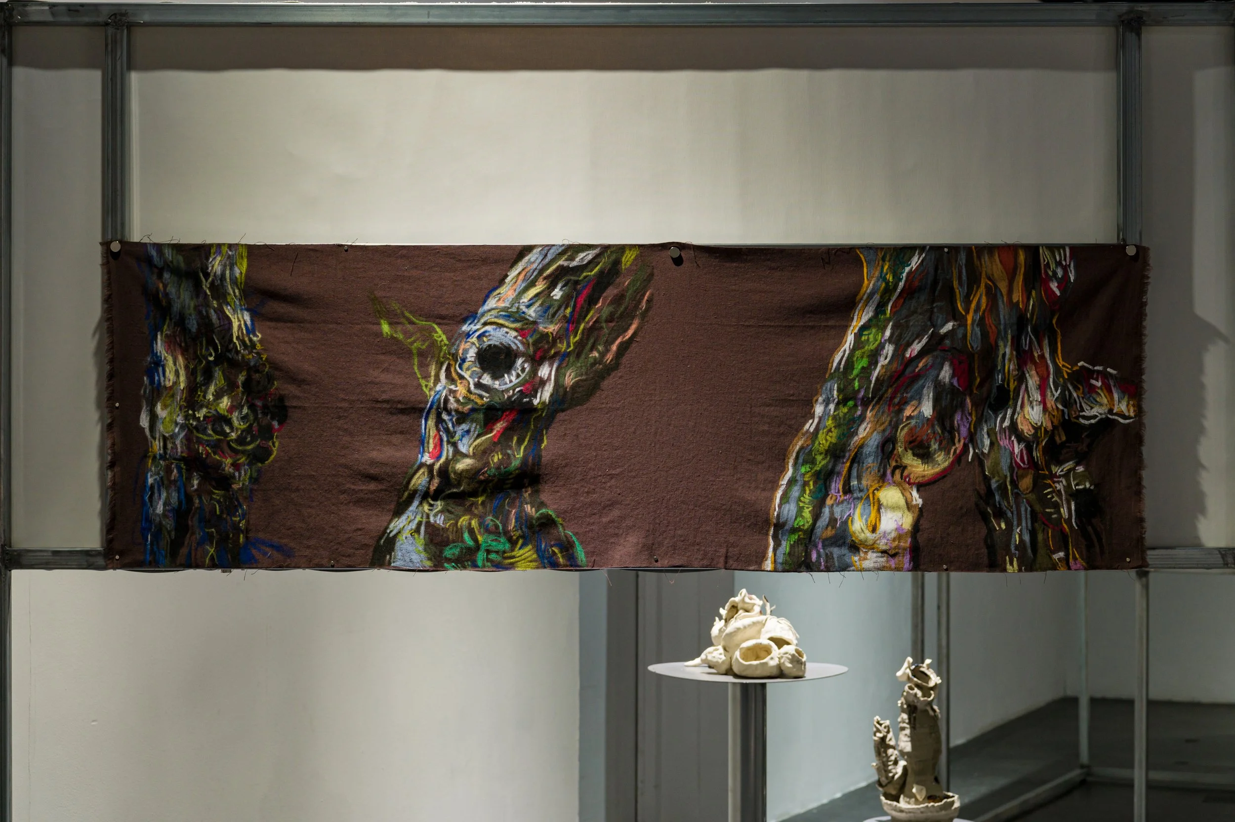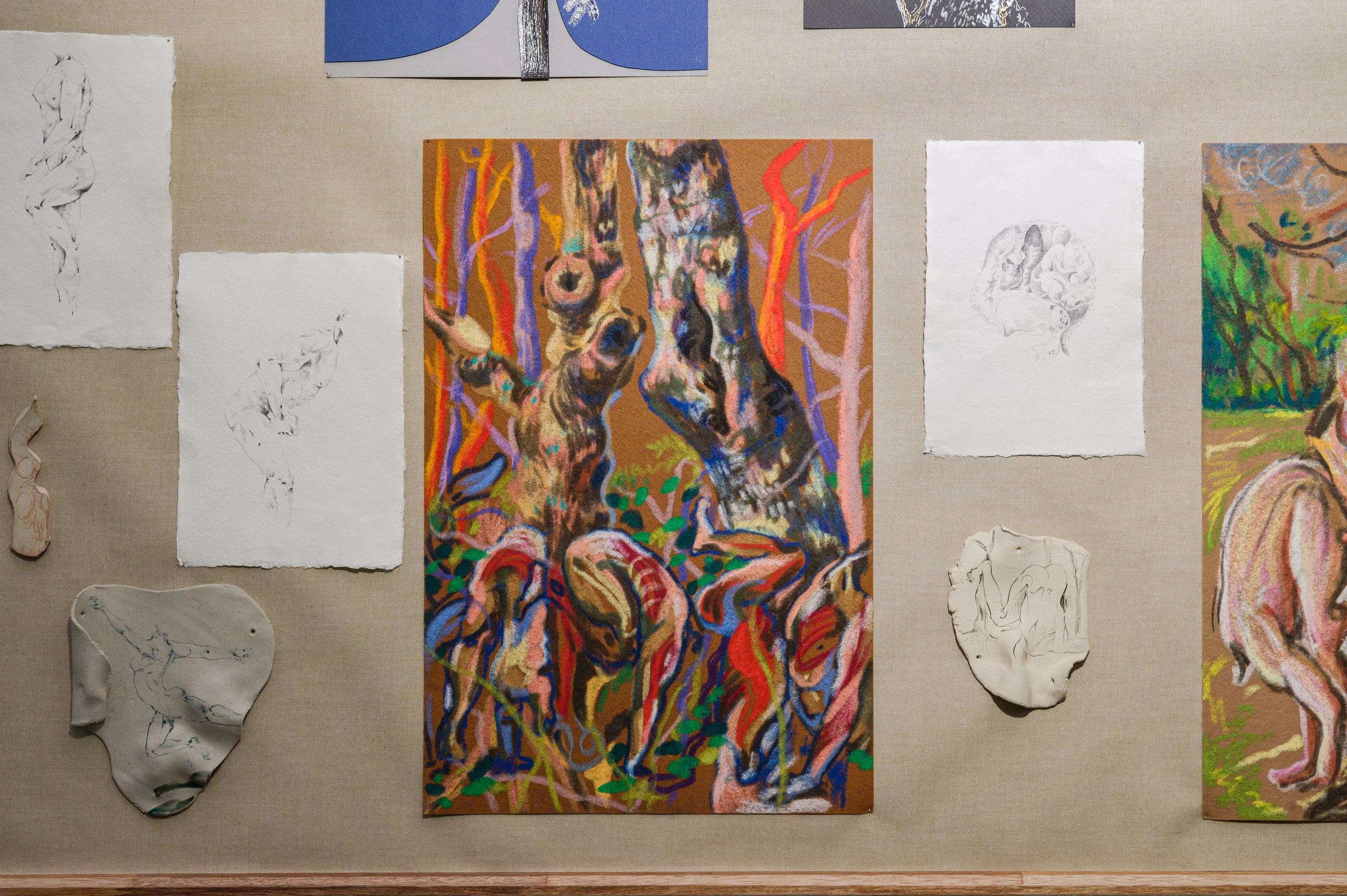작가와 오랜 기간 함께하여 몸에 체화된 재료인 흙으로 나무에게 줄 갖가지 병을 만들고 혹을 떼어다 붙이는 시간은 몹시 괴로웠을 것이다. 빠르게 쌓아 올리는 흙은 때로는 무너짐을 의도하면서도 가마의 불확실성에 기대기도 했다. 헤르니아가 보이는 인체, 점진적 과부하를 통해 비정상적 형태를 달성한 인체는 나무 상처 이미지와 교차한다. 유약과 안료가 뒤섞이며 구부러진 인체 드로잉과 기이한 모양의 도자기 표면을 사이를 더 단단하게 붙들어 맨다. 생존방식을 다루는 태도에서 작가가 투영했던 인상이 드러난다.