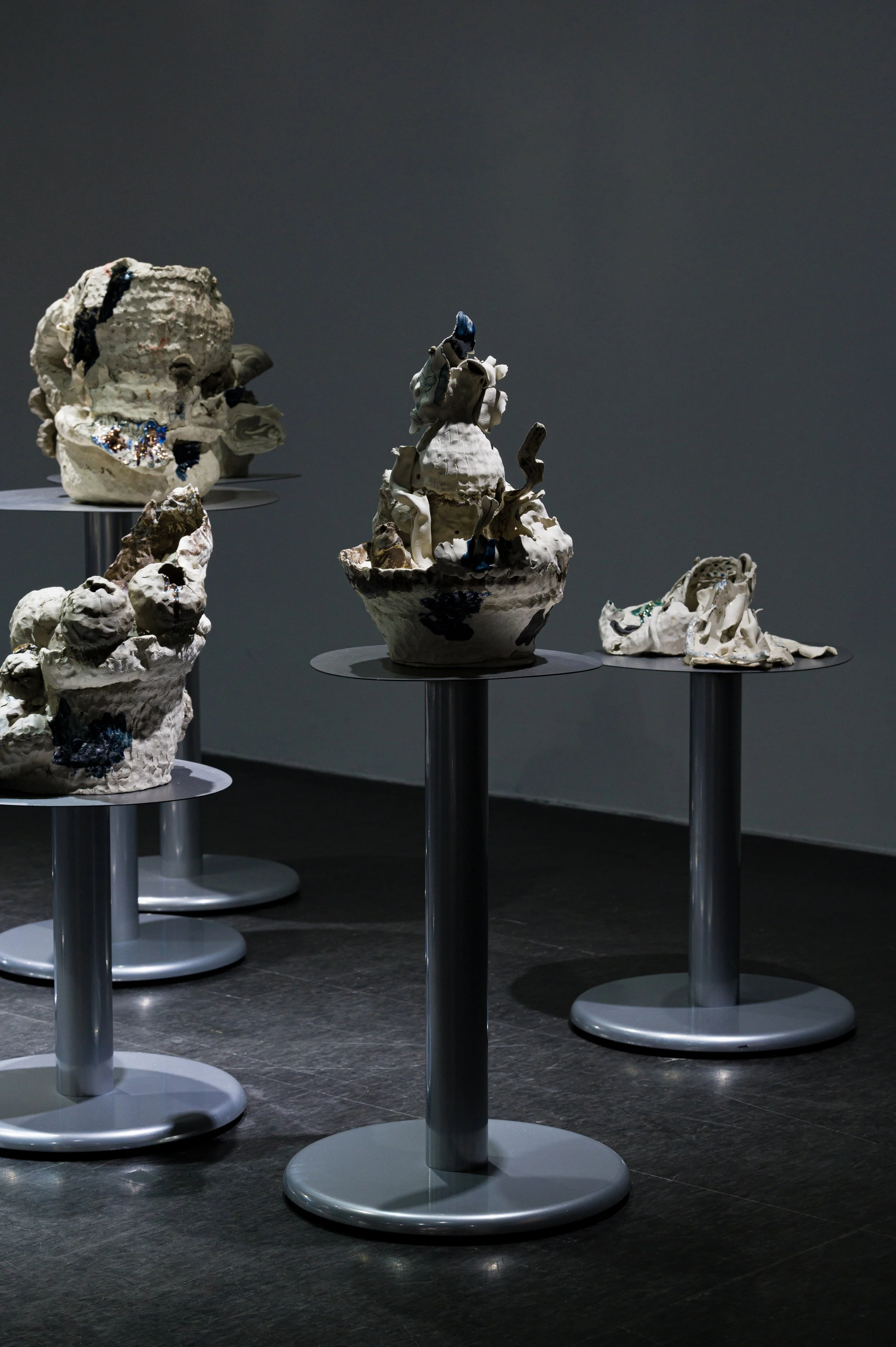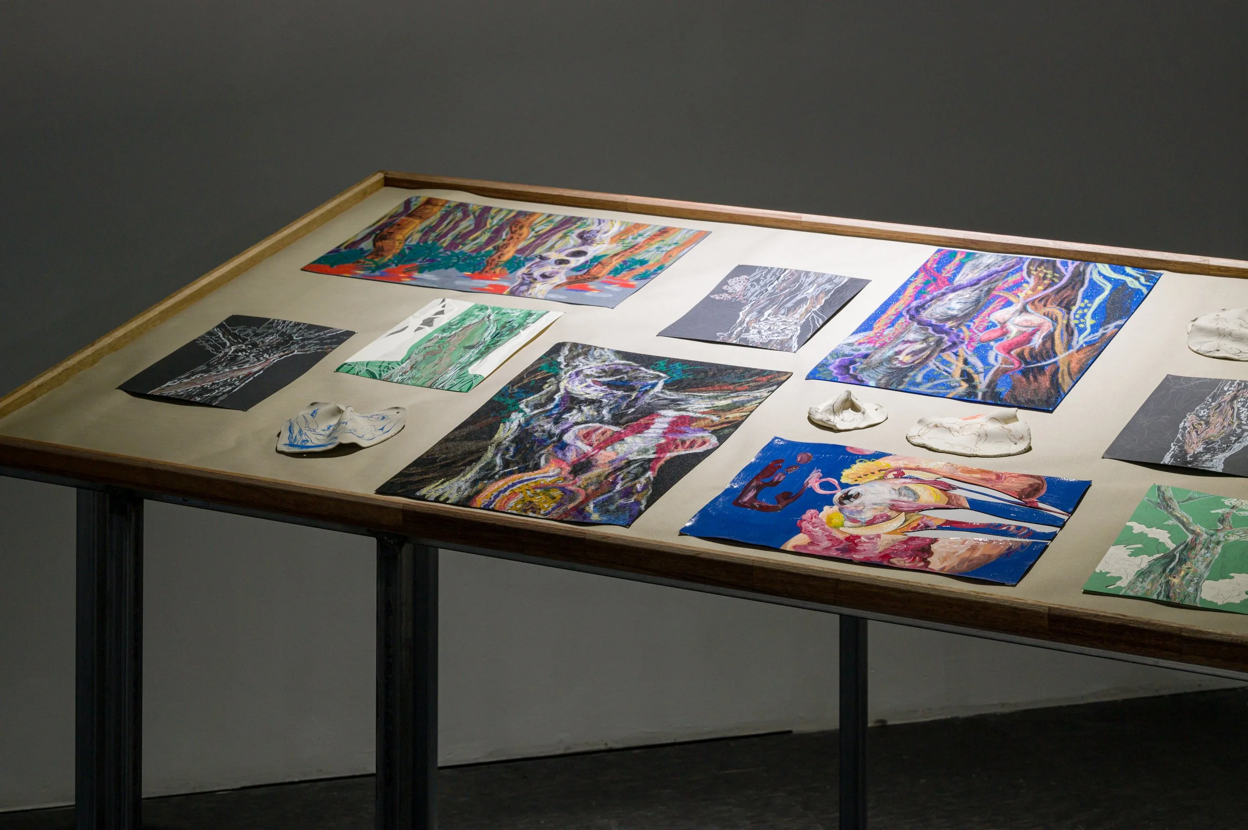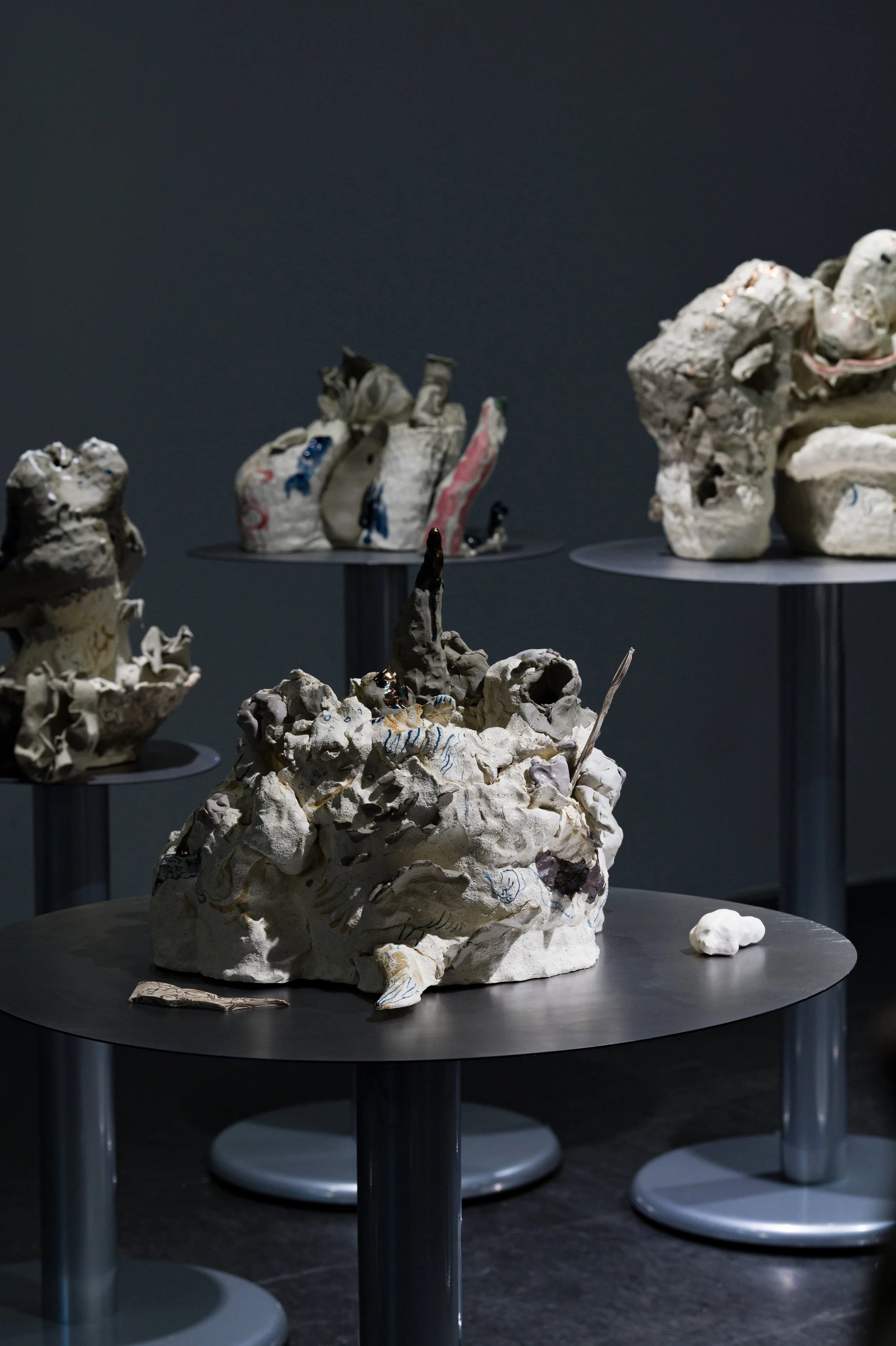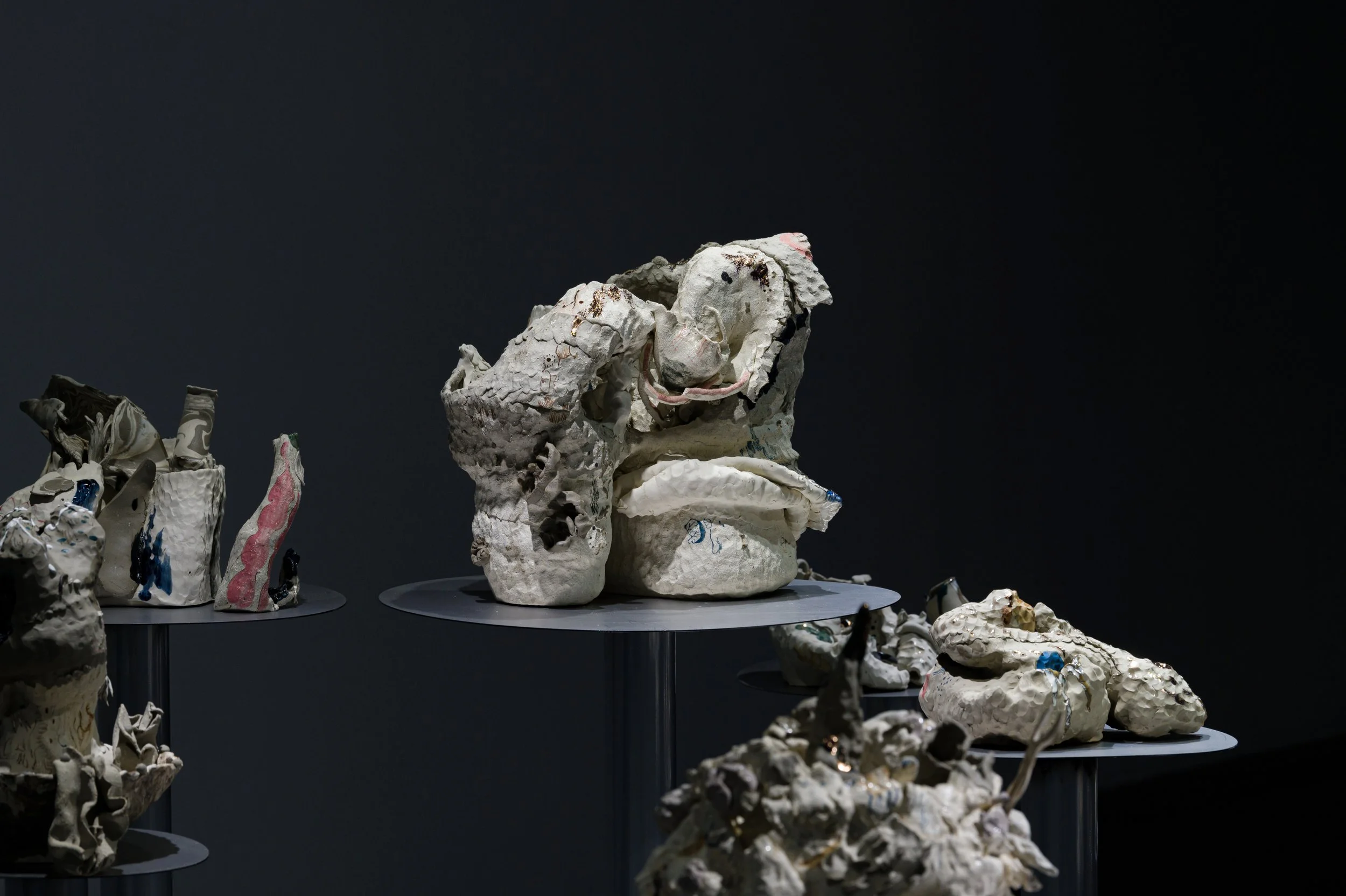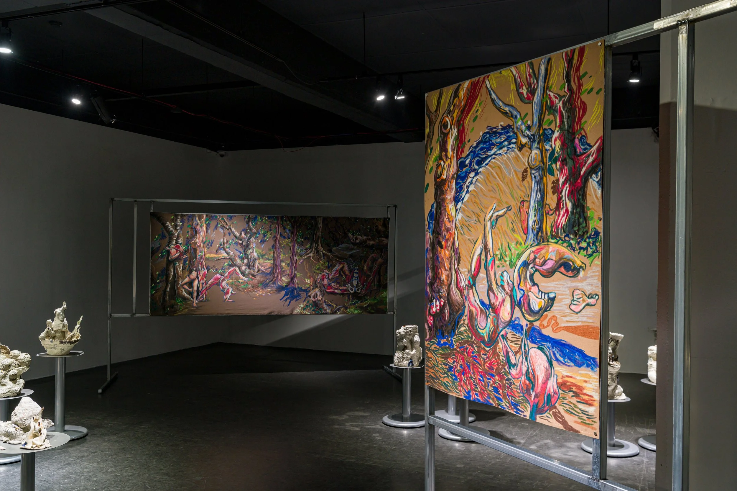 작가와 오랜 기간 함께하여 몸에 체화된 재료인 흙으로 나무에게 줄 갖가지 병을 만들고 혹을 떼어다 붙이는 시간은 몹시 괴로웠을 것이다. 빠르게 쌓아 올리는 흙은 때로는 무너짐을 의도하면서도 가마의 불확실성에 기대기도 했다. 헤르니아가 보이는 인체, 점진적 과부하를 통해 비정상적 형태를 달성한 인체는 나무 상처 이미지와 교차한다. 유약과 안료가 뒤섞이며 구부러진 인체 드로잉과 기이한 모양의 도자기 표면을 사이를 더 단단하게 붙들어 맨다. 생존방식을 다루는 태도에서 작가가 투영했던 인상이 드러난다.