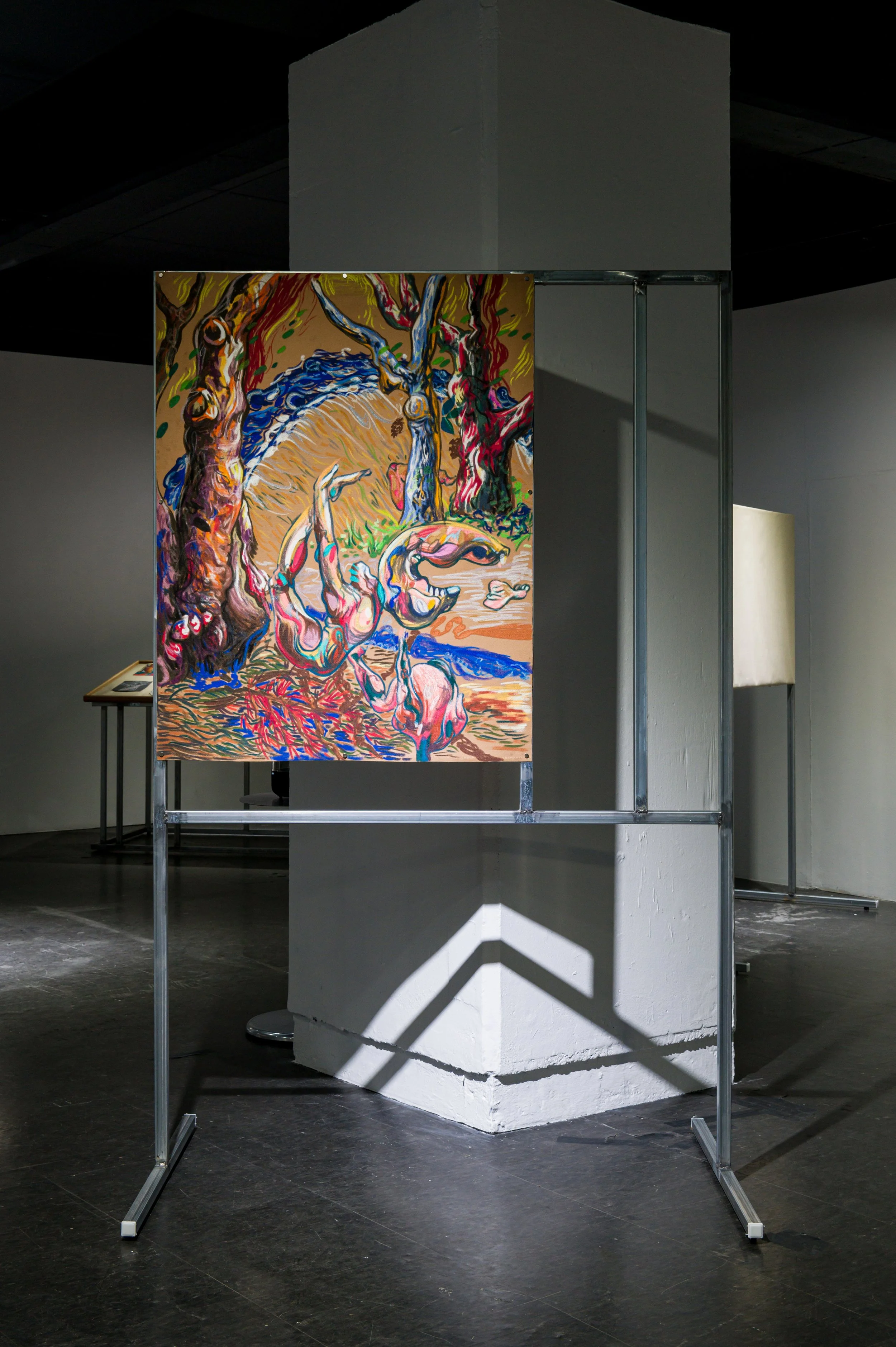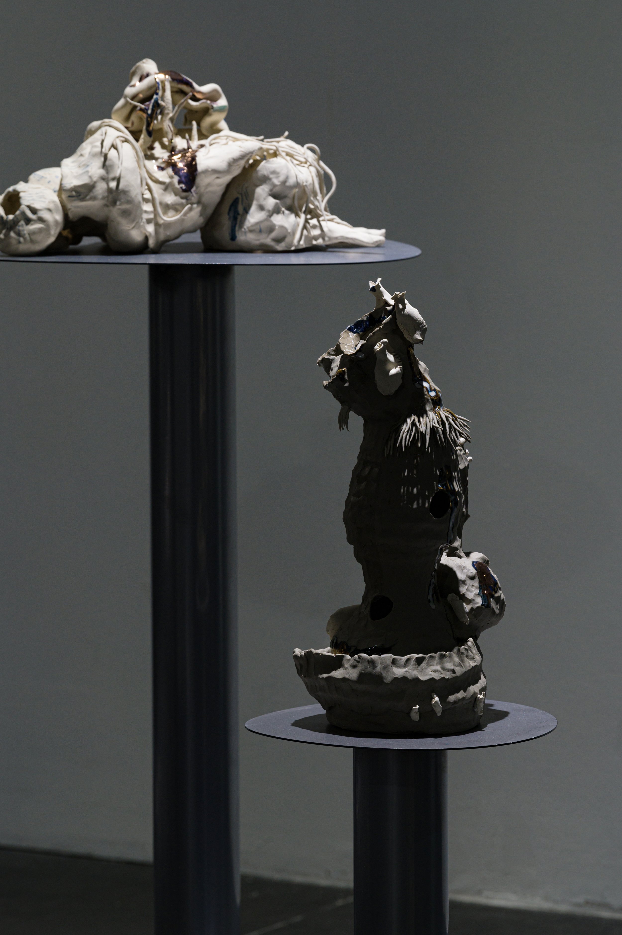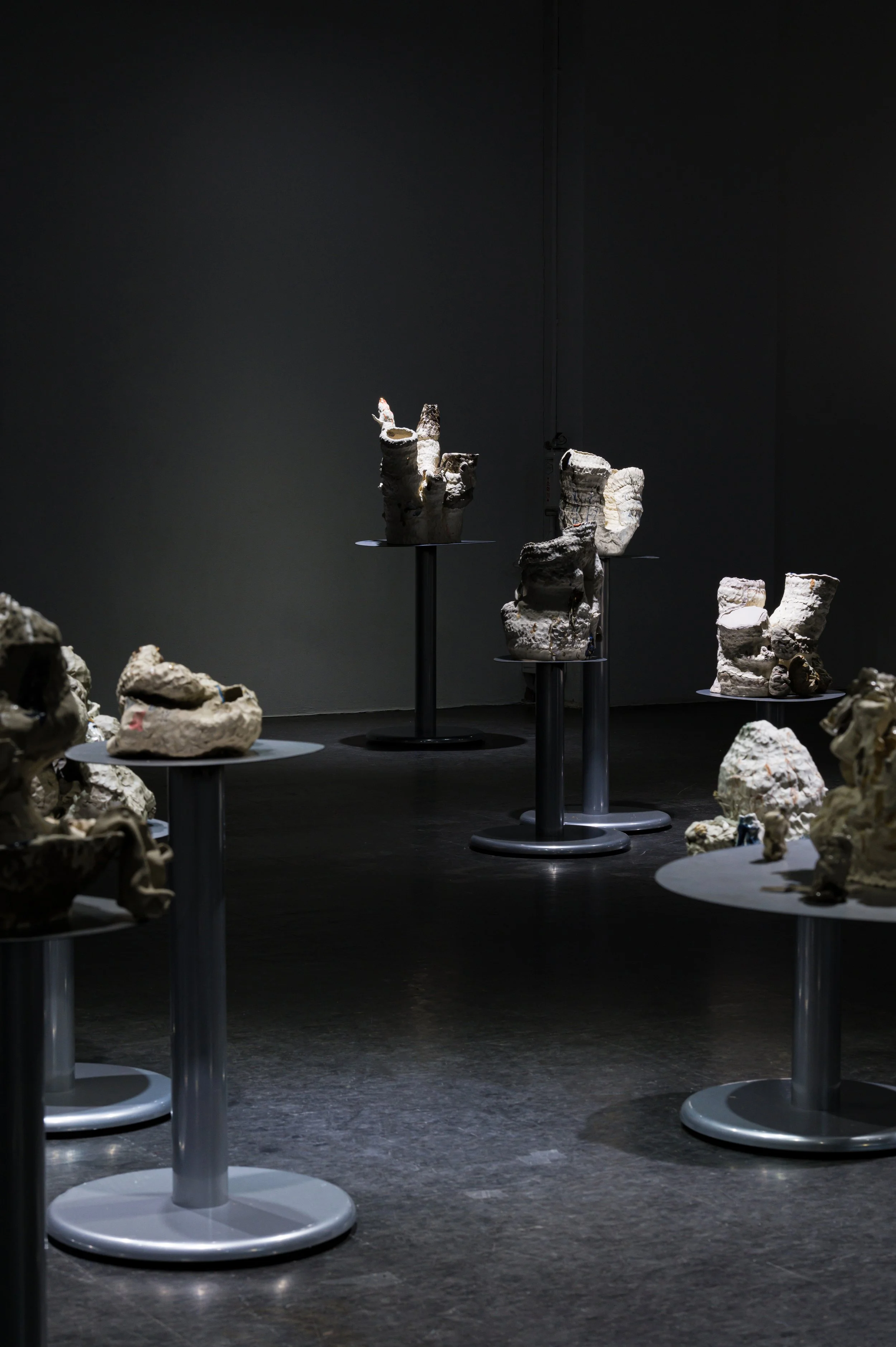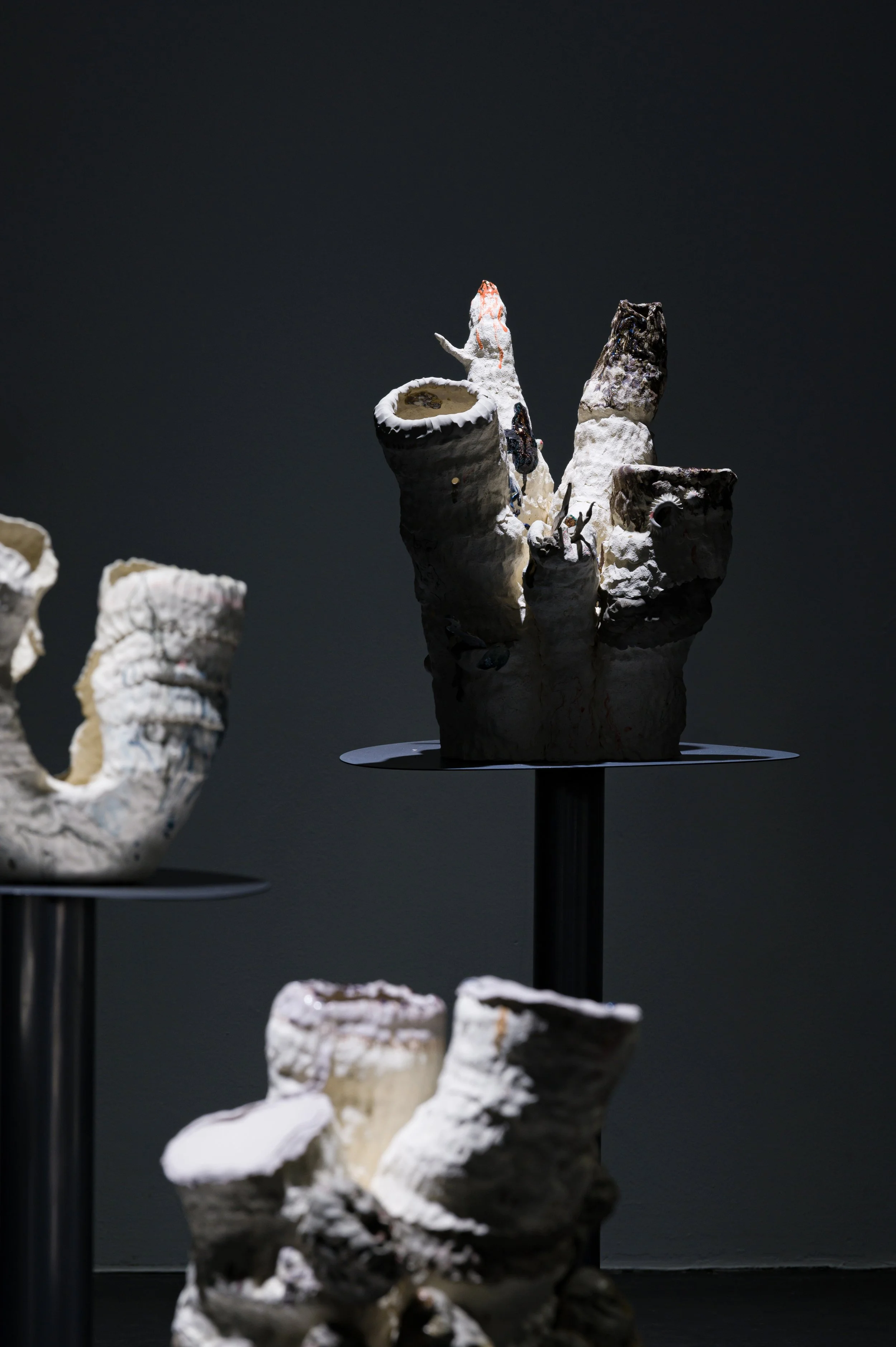 작가와 오랜 기간 함께하여 몸에 체화된 재료인 흙으로 나무에게 줄 갖가지 병을 만들고 혹을 떼어다 붙이는 시간은 몹시 괴로웠을 것이다. 빠르게 쌓아 올리는 흙은 때로는 무너짐을 의도하면서도 가마의 불확실성에 기대기도 했다. 헤르니아가 보이는 인체, 점진적 과부하를 통해 비정상적 형태를 달성한 인체는 나무 상처 이미지와 교차한다. 유약과 안료가 뒤섞이며 구부러진 인체 드로잉과 기이한 모양의 도자기 표면을 사이를 더 단단하게 붙들어 맨다. 생존방식을 다루는 태도에서 작가가 투영했던 인상이 드러난다.