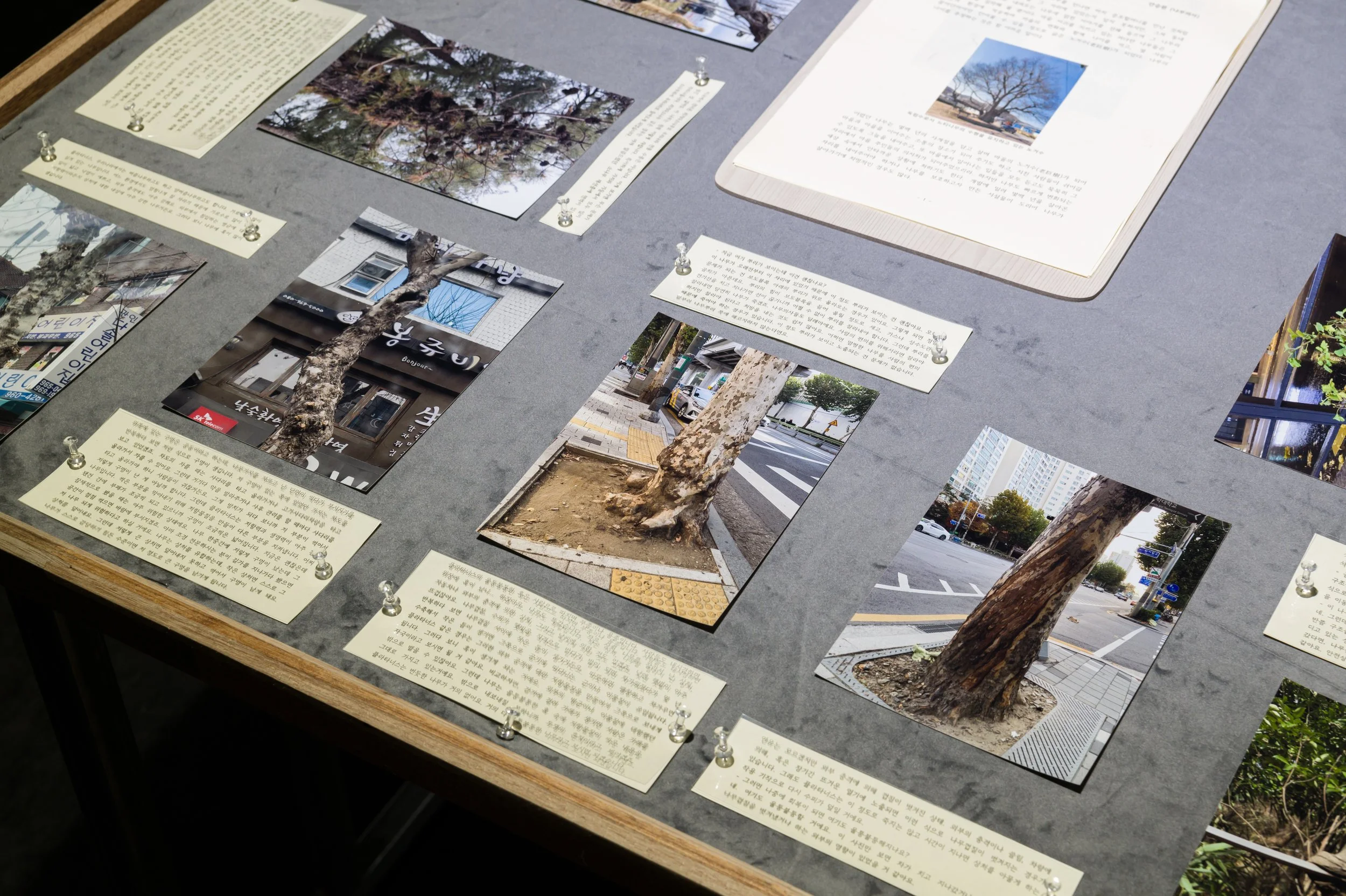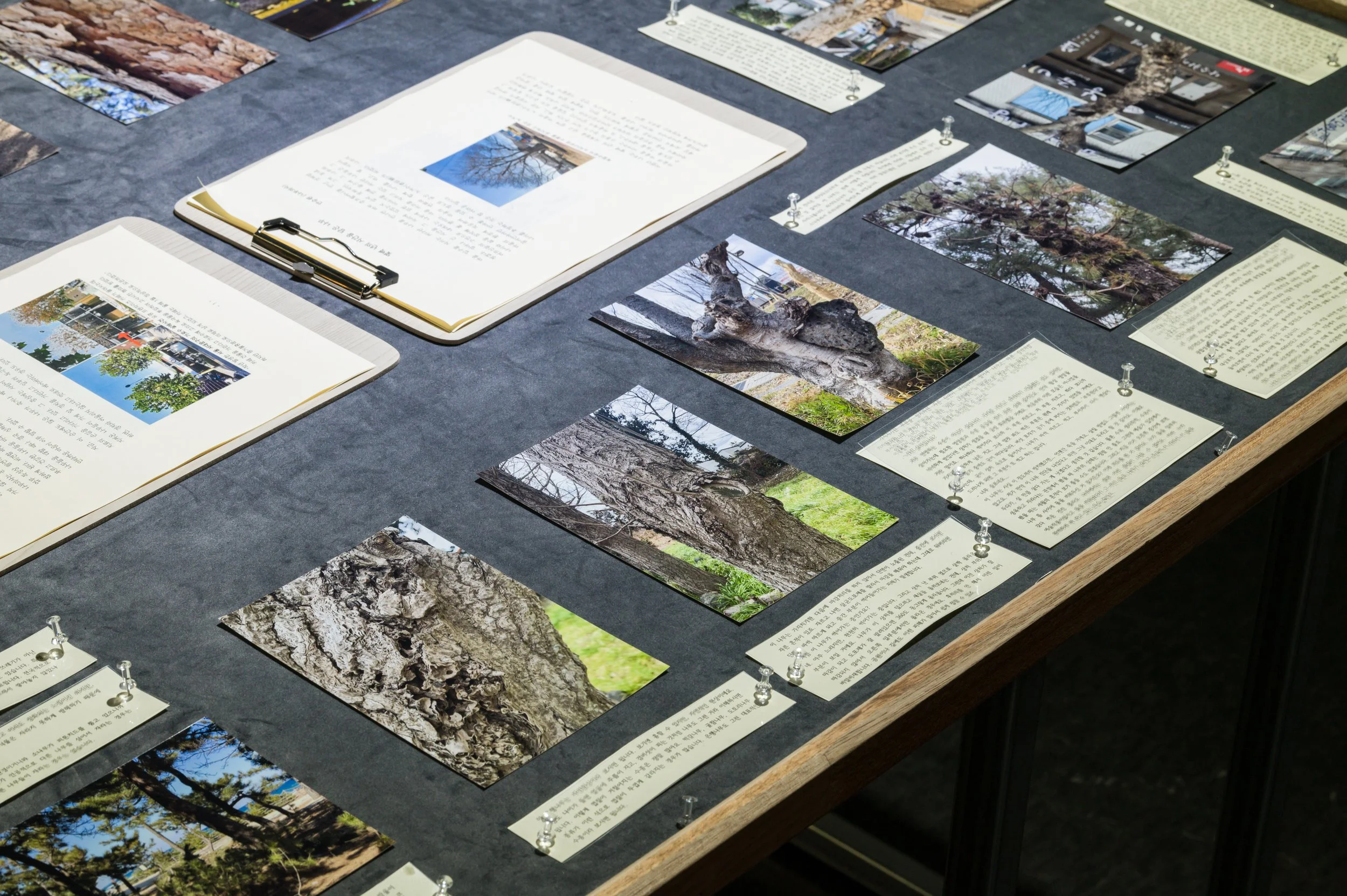 기획자, 작가, 협업작가는 수목의 생장이 더뎌지고 상처를 관찰하기 좋은 시점인 작년 가을부터 올겨울까지 가평 보납산, 서울 시내와 대학로, 경북 청송군, 제주도 비자림과 곶자왈, 팽나무군락, 동해 해송숲을 직접 답사하였다. 유연한 태도로 숲길을 걸으며 기후, 토양, 환경에 따라 달라지는 나무의 성장 과정, 상처부, 회복 방식을 관찰하고, 나무의사의 자문을 통하여 의견을 수집하였다.